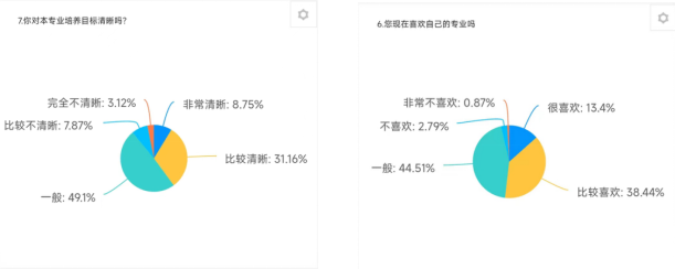 从问卷调查的最终结果中可以看出,仅有31.16%的同学对本专业的培养目标比较清晰,47.84%的同学对专业课程结构的了解程度一般,61.02%同学对本专业就业形势比较关注,还有29.2%的同学对本专业的就业方向不太清晰,此问卷调查一定程度上反映了同学们在专业认知方面存在的问题以及之后需要努力加强的方向。