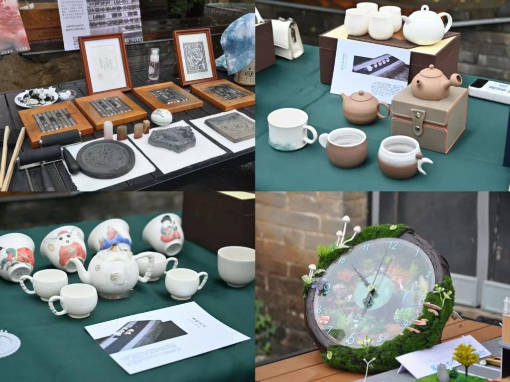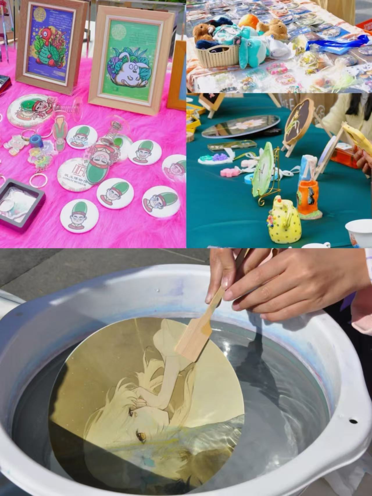 每一个小巧的作物,都承载着一份对于艺术的追求,一份热爱下经过付出和努力的实践。喧闹的跳蚤市场上,一转角就是它的清丽脱俗。每件饰物都代表着不同的寓意与祝福,依托于中华传统文化的魅力,使它们无须刻意,只那么静静的摆放在蓝色方巾上,等待着有缘人的到来。一朵莲花,一束芳草,镌刻在碟中,泼洒在扇上,镶嵌在璧里。中式古典审美如这璧上的莲花,亭亭玉立在会展中,绽放出与众不同的魅力。这套“莲韵手作”凭借硬古风的朴实和淡雅,引来了大量游客的驻足。古典与新潮的交汇与融合,二次元文化和团扇制作的碰撞,这些作品被命名为“扇动的艺术”,通过传统工艺品和现代审美的有机结合,丰富了团扇的表现形式,充分体现了新时代艺术应有的风采。