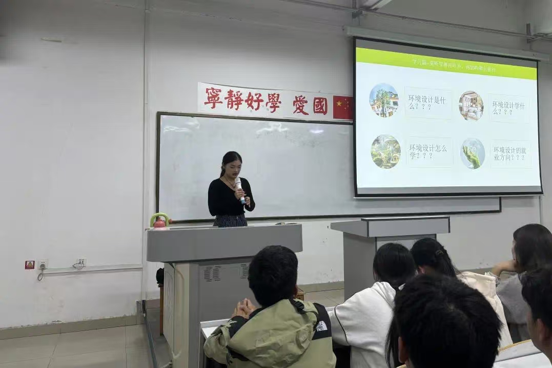 在活动中,王玉珍同学围绕学习、专业竞赛及职业规划等方面,从多个角度对进行深入剖析。首先,她详细阐述了环境设计专业是什么,让新生们对自己所学专业有了初步的认识。接着,她分享了环境设计的学习方法,强调大一要打好基础,认真学习专业基础知识,培养良好的学习习惯和思维方式。大二则要提升专业水平,积极参与专业竞赛,通过实践锻炼自己的能力。大三需细化专业方向,明确未来的发展目标。王玉珍同学谈到,在大三阶段深入学习室内设计、景观设计等核心课程,参加实际的设计项目,以提升自身的设计能力和实践经验。同时,关注行业动态,了解最新的设计理念和趋势,为未来的职业发展打下坚实的基础。到了大四,要全力冲刺,做好职业规划,参加各类招聘会,积极投递简历,同时加强专业知识的学习,为面试做好充分准备。