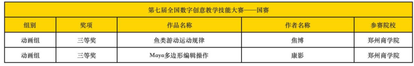 艺术学院高度重视本次大赛,广泛动员,积极组织,秉承“以赛促教、以赛促学”的理念,精心组建参赛队伍,认真备赛磨课,最终参赛教师们凭借出众的教学实践创新应用能力和教学艺术感染力,焦博老师的参赛作品《鱼类游动运动规律》、康影老师的参赛作品《Maya多边形编辑操作》分别获国赛三等奖。