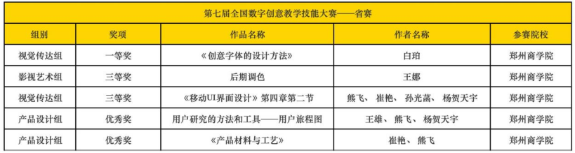 近日,第七届全国数字创意教学技能大赛省赛、国赛获奖名单相继揭晓,我院获国赛3等奖2项,省赛等级奖3项、优秀奖2项的佳绩。