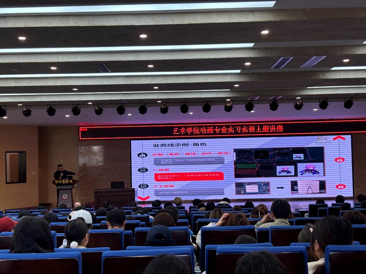 此外,来自郑州读书阁数字科技有限公司的陈总和贺老师也为学生带来了精彩的分享。首先,陈总深入剖析了技术应用在动画行业中的持续渗透与不断拓展。近两年来,依托AI技术创作的动画作品呈爆发式增长态势,如洪流般大量涌现,广泛涵盖了AI辅助的角色设计、绘本设计、动画短片与短视频生成等多个维度。陈总并通过一系列富有启发的案例,结合详实精准的数据支撑,向同学们展示了AI技术与动漫产业深度融合所取得的卓越成就。在此基础上,鼓励学生们充分利用课余时间学习探索AI技术,创建个人的抖音账号,展示作品的同时探索获取额外收益的可能性,实现个人价值与社会效益的双重提升。