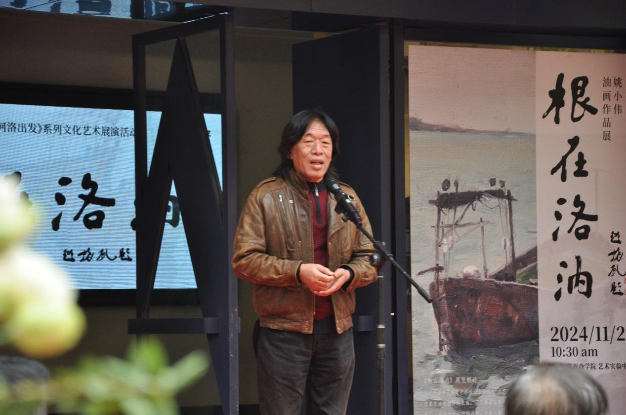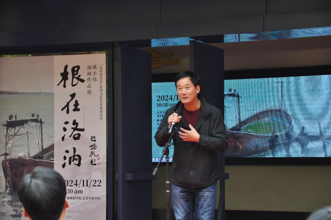 河南省艺术教育协会副会长赵振乾教授代表参展画家的母校致辞,他肯定了参展画家姚小伟老师近四十年的创作成果,是河南油画艺术的代表性画家,并鼓励pg电子官方网站发挥河洛文化发祥地的优势,为高校交流和河洛文化发展搭建平台。