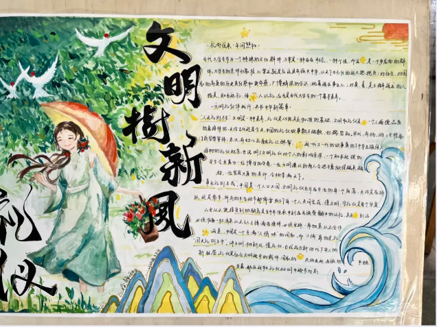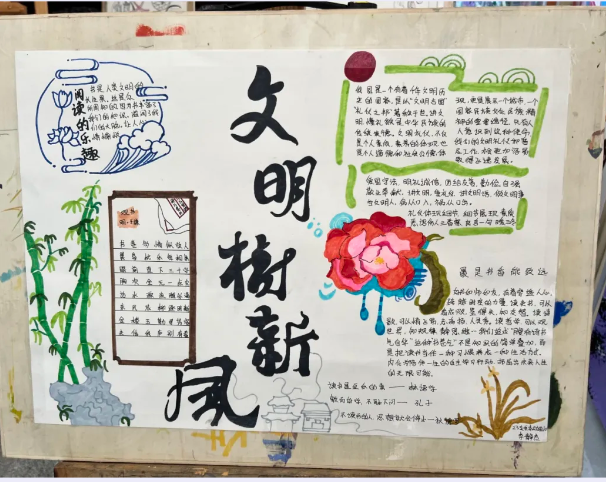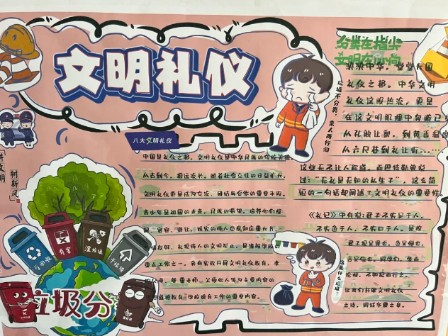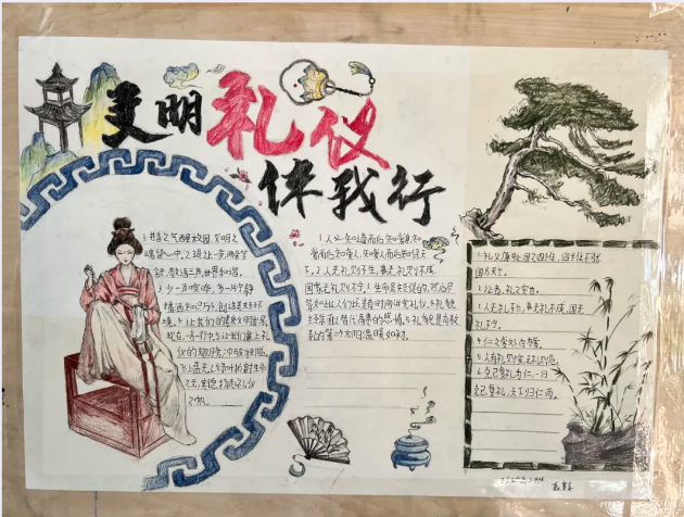 为全面提升同学们的思想道德素养和文明礼仪素质,塑造文明有礼、积极向上的校园文化氛围。艺术学院近日组织开展了大学生校园文明礼仪主题教育活动,组织各班同学以“文明礼仪”为主题,制作手抄报,展现当代大学生的文明礼仪风采。