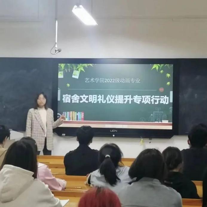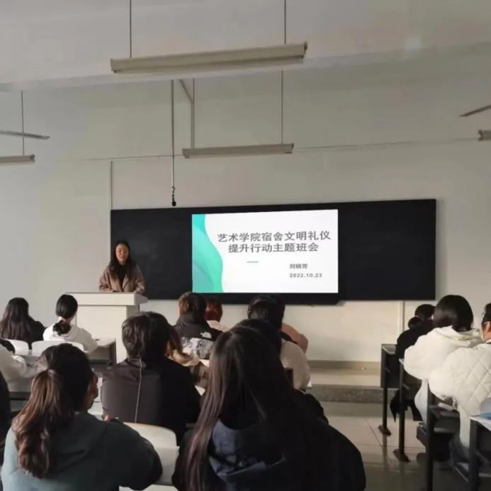 为做好学生日常管理工作,有序推进校园安全稳定和学生宿舍“六化一家园”建设,为同学们营造干净、舒适、安全的生活环境。艺术学院在第一次宿舍卫生专项行动基础上开展宿舍文明礼仪提升行动,10月24日上午10:30在艺术大楼会议室召开“宿舍文明礼仪提升专项行动工作”动员会,艺术学院全体师生参与本次会议。
