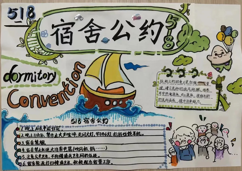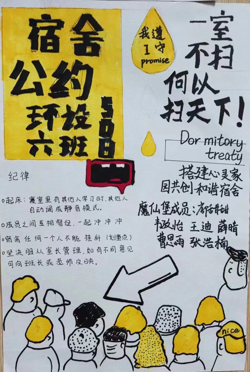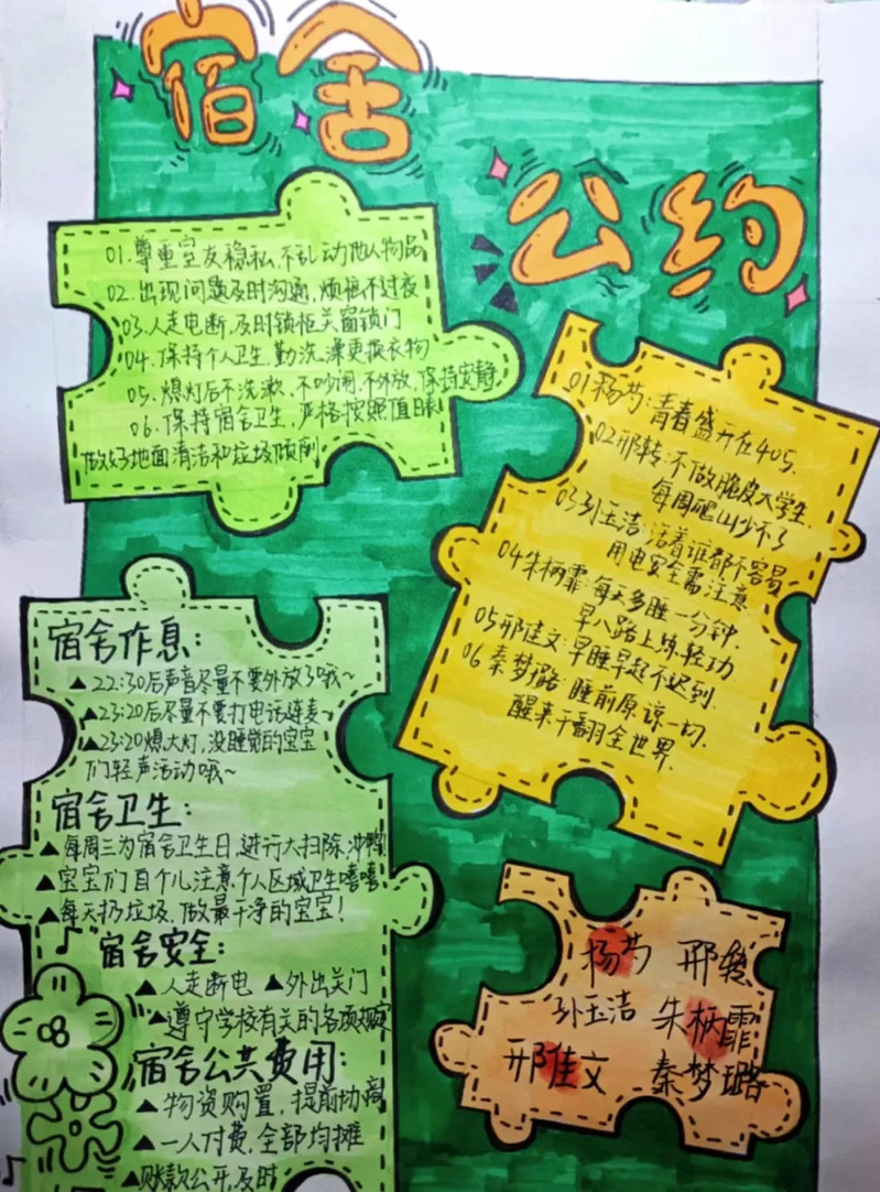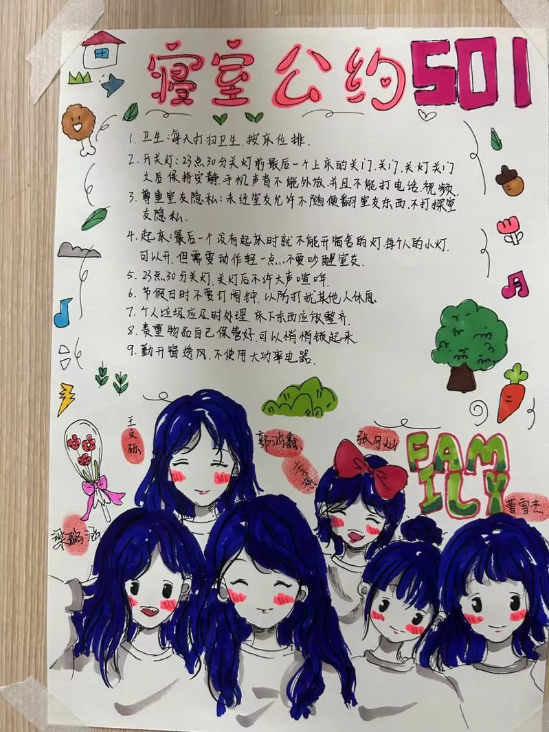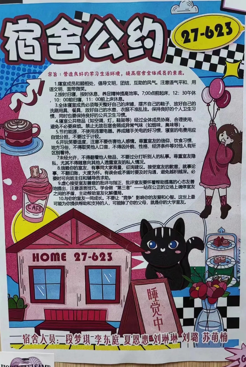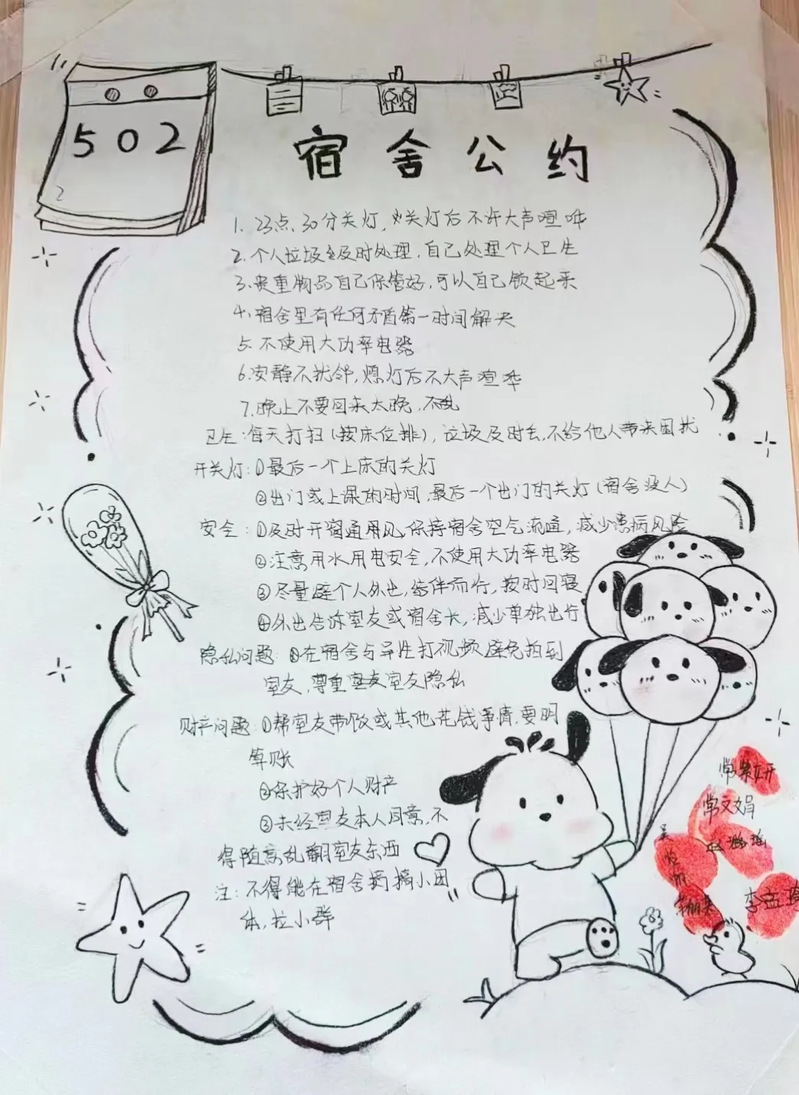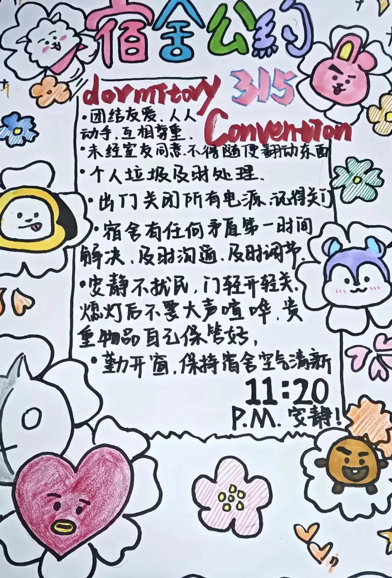 宿舍生活是大学生活不可或缺的一环,在寝室收获着来自天南海北的温暖,自由舒适的寝室氛围,也需要一份郑重且不失风趣的宿舍公约,新学期的到来,2023级的同学们也都遇到了新舍友新同学。下面让我们一起看看那些具有代表性的宿舍公约吧。