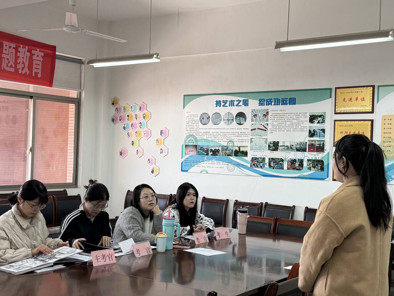 在视觉传达设计专业的复试模拟中,学生按照复试考察顺序有序问答,在综合能力考察中展示了自己实际解决问题的能力,专业问答上教师们也建议学生加强对跨领域知识的关注,同时针对学生的作品集提出优化性建议,强调系统呈现设计过程。