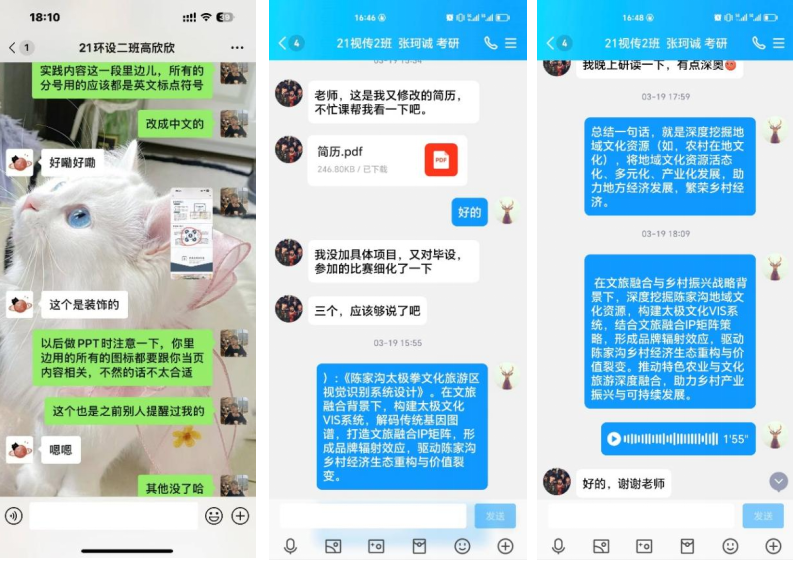 在工作之余,艺术学院考研组老师也没有停止辅导,不厌其烦地解答学生疑问,不计回报地加班加点,以线上线下同时推进的形式来为学生进行辅导。从简历和作品集的制作,再到专业知识的打磨,一对一辅导因材施教,为学生定制最优方案。