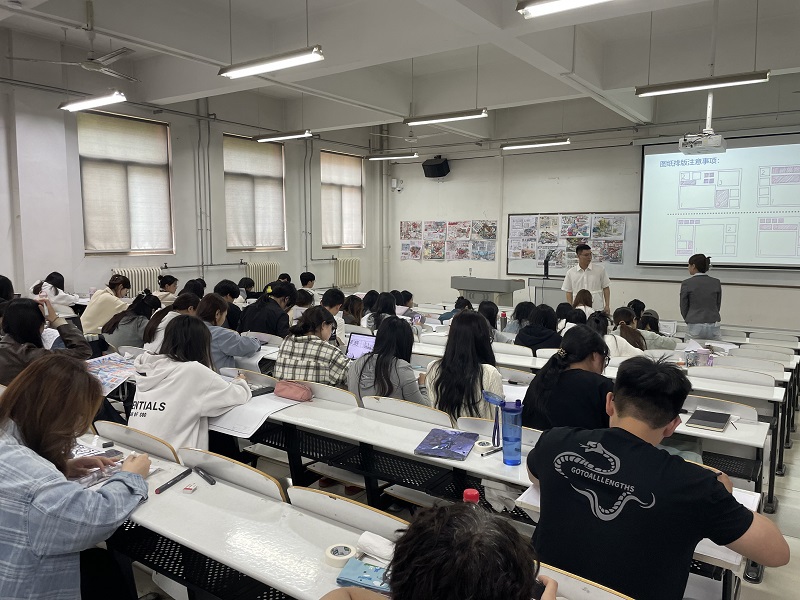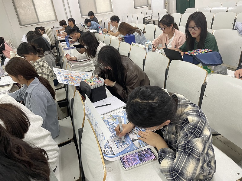 “时间紧、题量大,非常考验我们的基本功和应变能力。”参与测评的学生常浩田表示。考场内,同学们全神贯注,通过马克笔、彩铅等工具快速勾勒线条、铺陈色彩,展现出环境设计专业学生扎实的构图能力和艺术表现力。测评结束后,考研组三位教师对作品进行集中评图,从“设计逻辑、技法表现、创新性、完成度”四个维度出发,逐一评审。