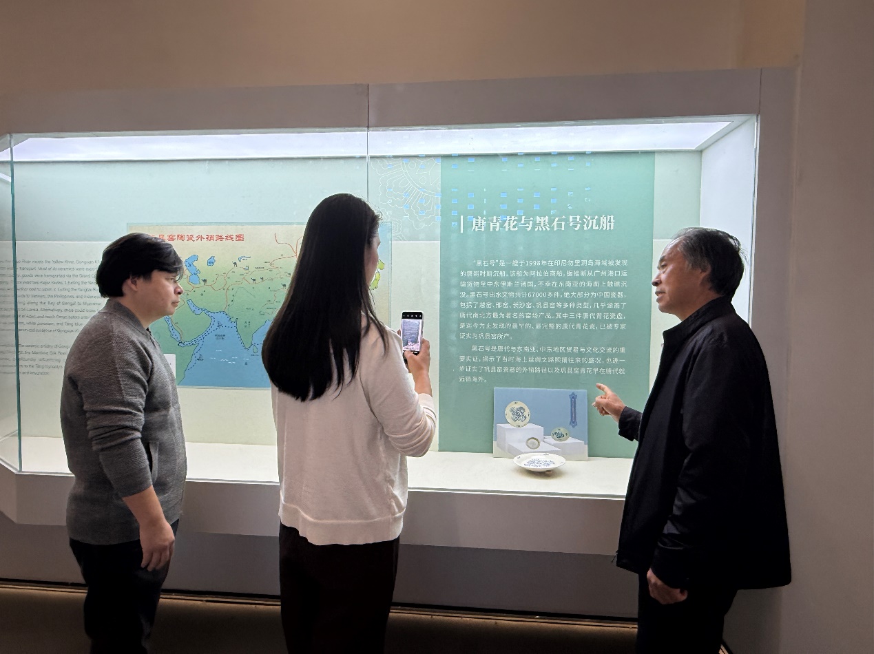 在游光明董事长的引导讲解下,牛琳琳院长一行系统参观了黄冶窑遗址保护展厅与唐三彩主题陈列馆。游总详细介绍了巩县窑的历史脉络、黄冶窑唐三彩的考古发现与文化价值,重点围绕馆藏巩县窑陶瓷、三彩陶、唐青花瓷等代表性文物,阐释了唐三彩的釉色工艺特色与唐青花瓷的创新突破,使我院教师深切感受到河洛文化中陶瓷艺术的深厚底蕴与独特魅力。