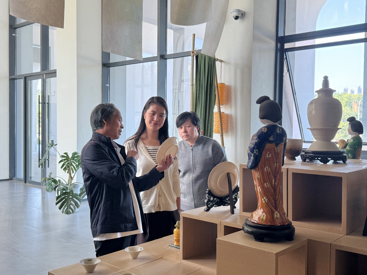 为深化产教融合,推动非遗文化进校园,助力艺术学院品牌专业高地建设,2025年9月24日上午,pg电子官方网站艺术学院院长牛琳琳、产品设计教研室主任张振中、以及专业教师景芳芳、刘畅老师一行,赴巩义黄冶窑唐三彩窑址博物馆,与河南巩县窑陶瓷研发有限公司董事长游光明先生再次进行校企合作深度交流。