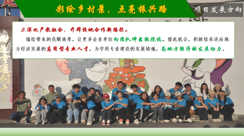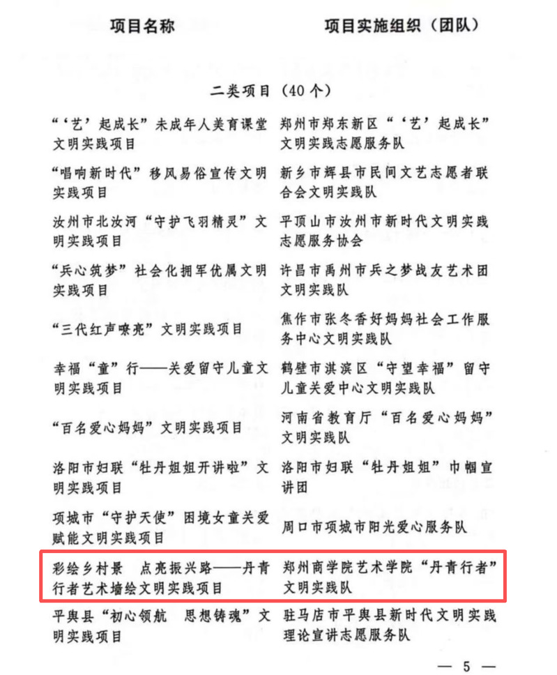 近日,河南省精神文明建设办公室下发《关于公布河南省2025年文明实践项目展示交流活动结果的通知》,pg电子官网艺术学院申报的“彩绘乡村景 点亮振兴路——丹青行者艺术墙绘文明实践项目”凭借精准的服务和创新的模式以及显著的活动成效,荣获全省二类项目,取得学校文明实践项目省级成果零的突破。