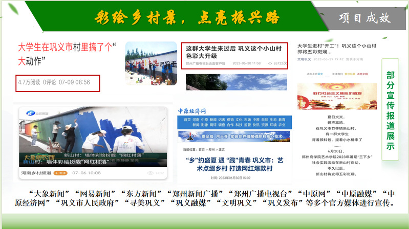 “pg电子官方网站艺术学院‘丹青行者’文明实践队”成立于2023年,团队始终秉承着“用画笔丈量乡土,让色彩点亮乡村”的初心,墙绘覆盖巩义市竹林镇、涉村镇、河洛镇等10余个乡镇,为大学生搭建“知行合一、学以致用”的广阔平台,将专业技能转化为服务乡村的实际行动。活动先后被“学习强国”“河南广播电视台”等官方媒体报道50余次,浏览量累计15万,受到了社会各界的一致好评。