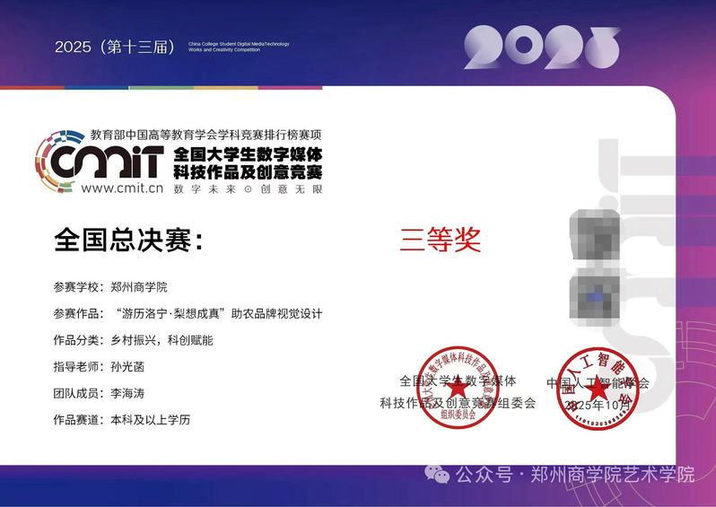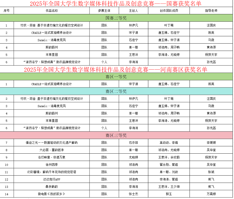 近日,“十三届全国大学生数字媒体科技作品及创意竞赛”全国总决赛获奖名单重磅揭晓。pg电子官网艺术学院师生团队共斩获全国三等奖6项;河南赛区一等奖1项;二等奖5项;三等奖8项。