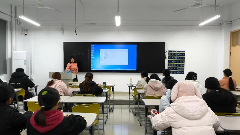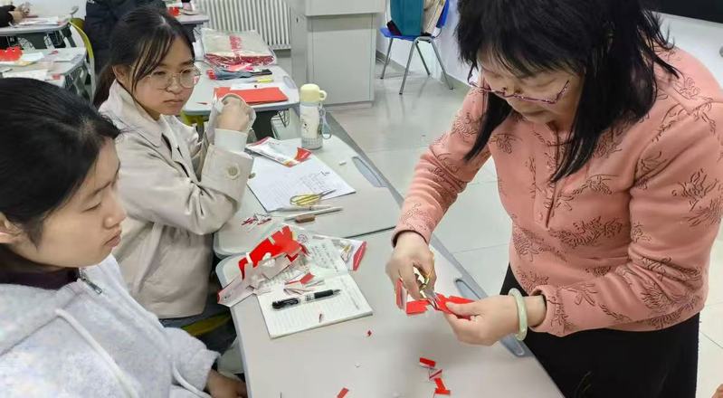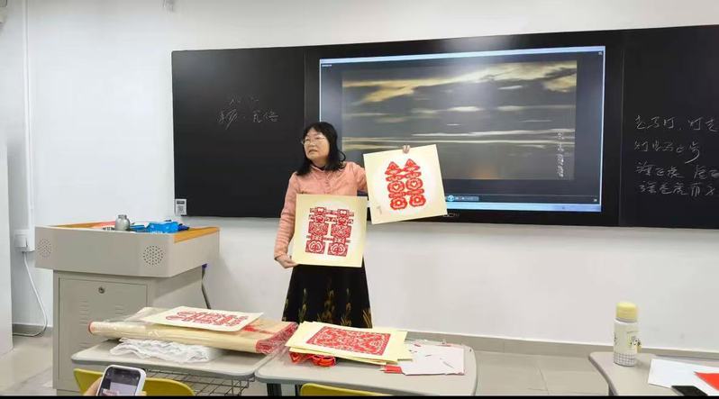 接着,伴随巩义河洛剪纸的文化视频播放,曹老师结合视频讲解了从古老民间习俗到当代艺术创新的传承脉络,千年非遗的文化底蕴在课堂中缓缓铺展。实操环节里,曹老师俯身指导折叠角度与剪刻力度,原本生疏的学子们逐渐掌握技巧,当一张张鲜红“双喜”展开时,教室内漾起惊喜的赞叹。
