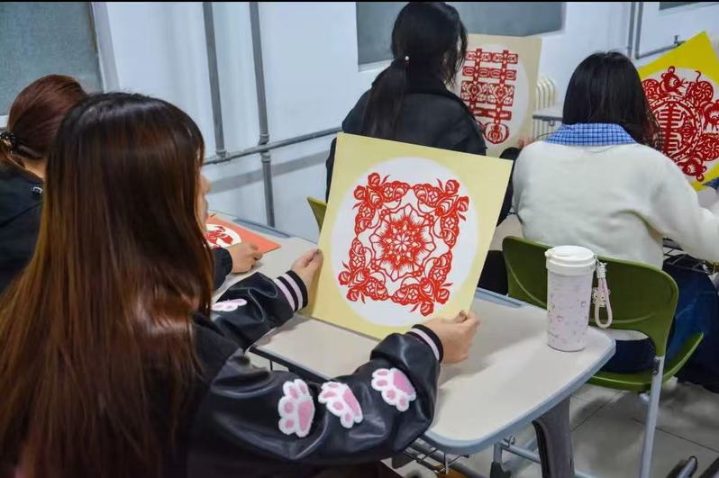 课堂上,曹慧贞老师从河洛剪纸的定义、特点入手,深入阐释了剪纸艺术的文化意义,让同学们对这门非遗技艺有了初步认知。她还展示了多幅个人创作的剪纸作品,这些作品题材多样、工艺精湛,每一幅都蕴含着深厚的文化底蕴与艺术巧思。作品传看环节,同学们近距离感受剪纸细节,对其艺术价值赞叹不已。