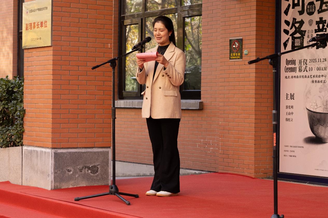 紧接着,梁爽总会计师代表省文旅投资集团祝贺展览开幕,他指出集团正以“行走河南,读懂中国”品牌为核心推动文旅融合,而高校是文化创新的重要力量。他表示愿与学校深化合作,在非遗活化、文创研发等领域携手,推动作品市场化。